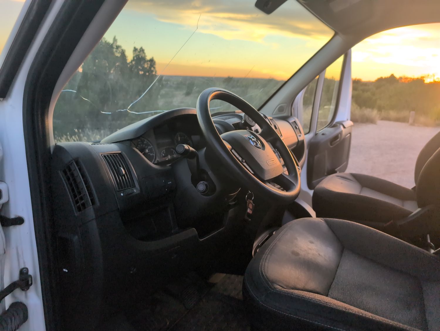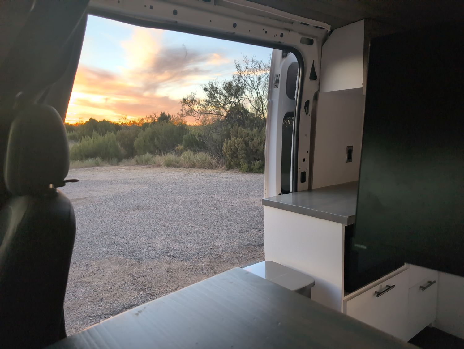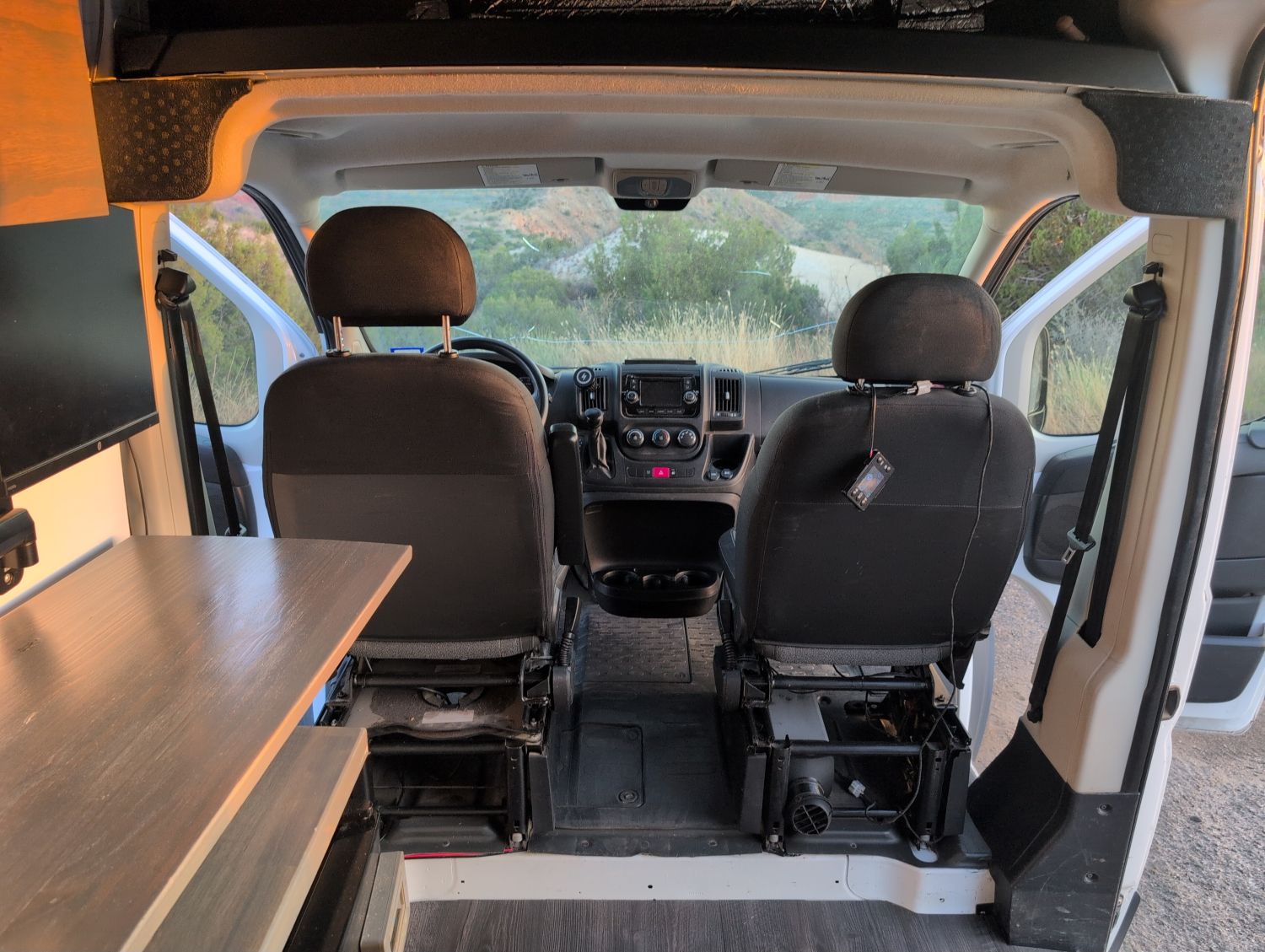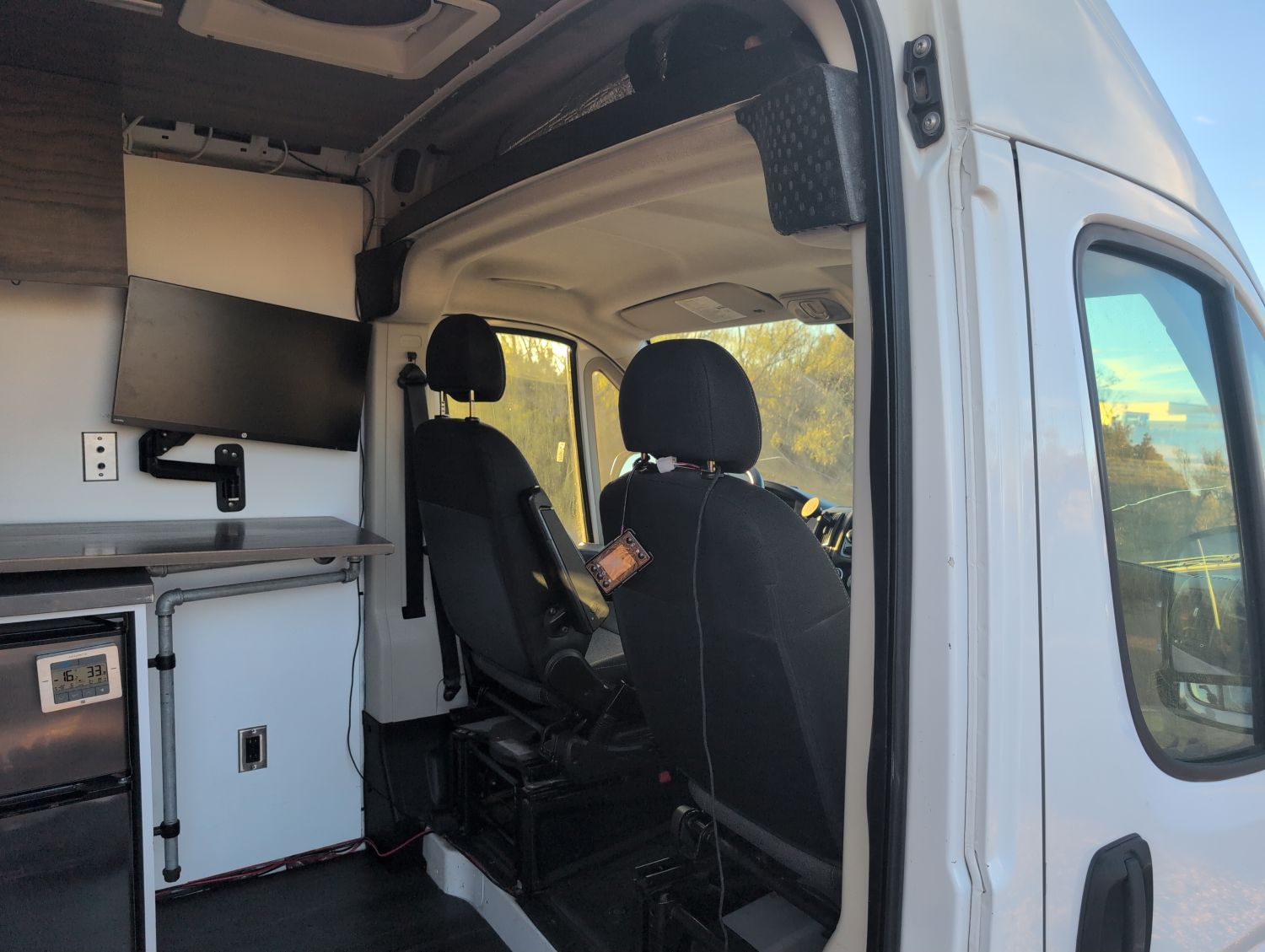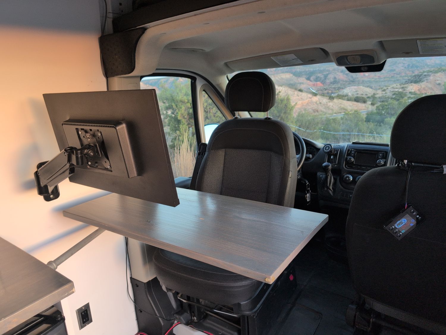 The fixed, full‑length bed eliminates daily setup, while the adjustable sit/stand desk serves as both a workstation and a dining table; perfect for someone who works full-time on a computer and needs reliable power and ergonomics on the road. A diesel heater and dual rooftop fans ensure all-day comfort in any climate.