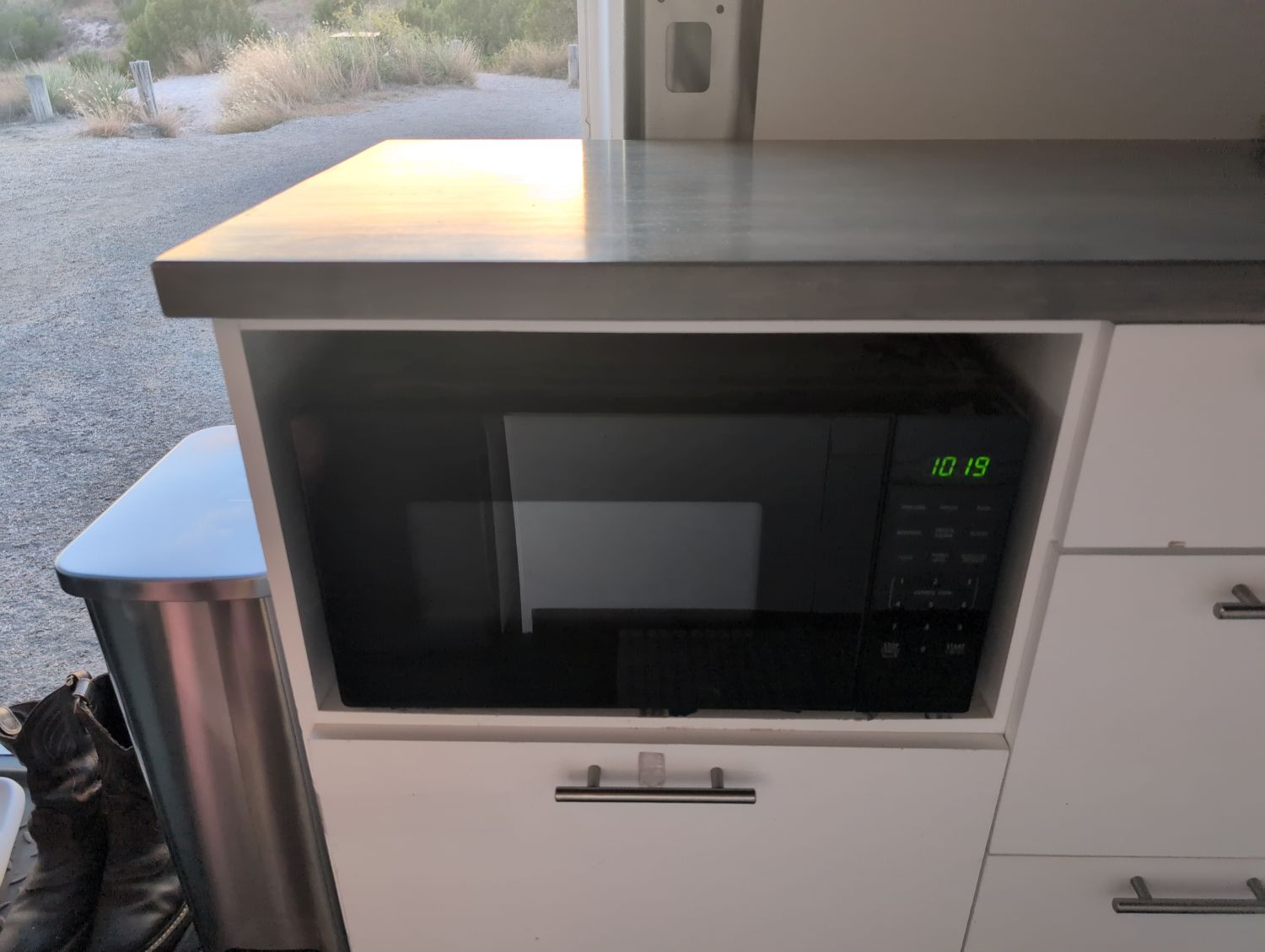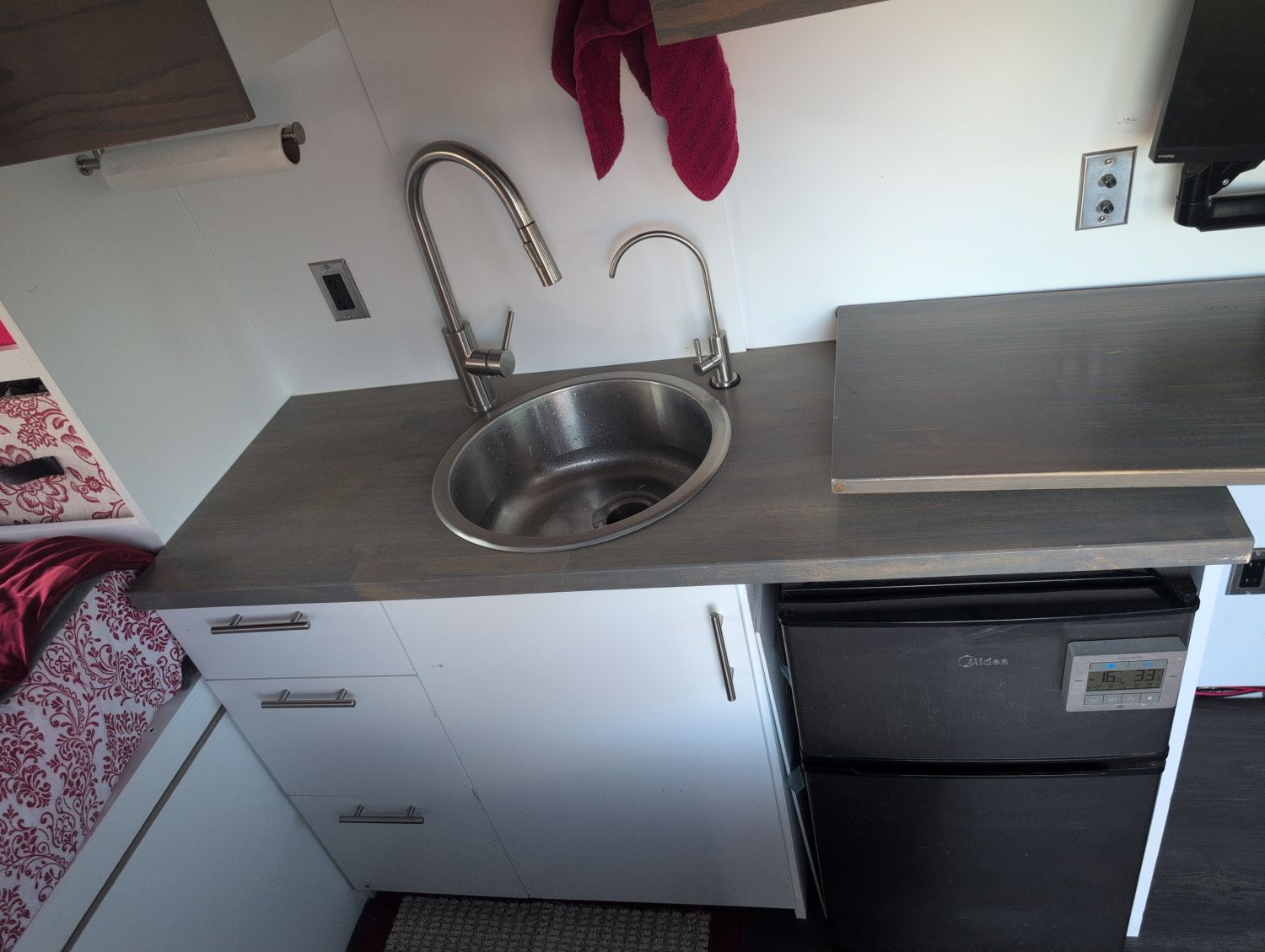 The kitchen has generous countertop space, complemented by the office desk that can be folded out for extra prep area if needed. The water and electrical systems are tucked into a spacious rear “garage”, leaving the interior uncluttered and spacious. A deep sink, gooseneck faucet, compact fridge, microwave, and portable cooktop set you up with most of the conveniences of a typical kitchen.