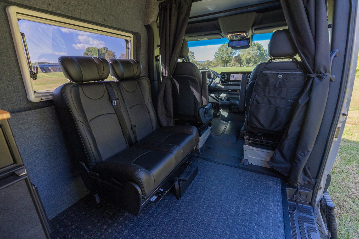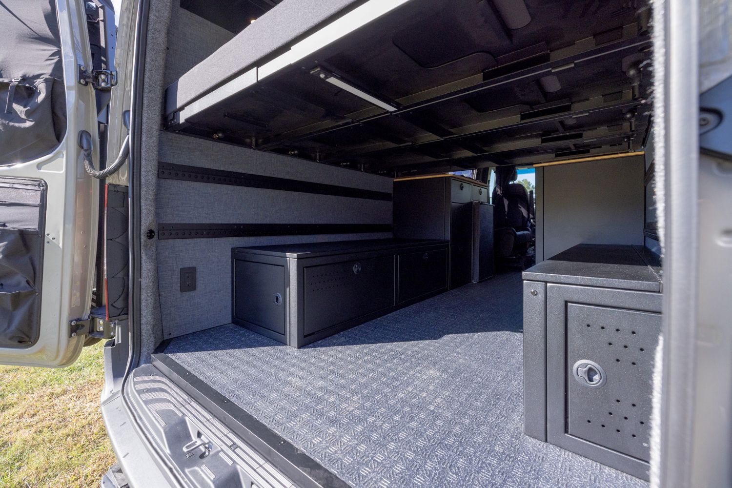 Experience true comfort and convenience with: premium fabric walls, vinyl ceilings, durable Lonseal Lonridge coin flooring, LED ceiling puck lights with dimmers, and a GoCode Trim kit with Memphis Bluetooth Audio and Sub/Amp. Swivel driver and passenger seats, a Broad Arrow 860 bifold bench seat, and Broad Arrow windows with built-in screens and blinds enhance the living space. Practical features like Van Windows Direct bunk windows (two with dual exhaust fans), a VanWife Components Bed/Bench transformation, a VanWife headliner shelf, and a Laveo Dry Flush toilet in a custom box complete the package. The entire van is fully sound deadened with Kilmat and insulated with Thinsulate for a quiet and comfortable ride. A rear water system with a 28-gallon undermount tank and electric pump, plus a rear shower sprayer, adds to the self-sufficiency.