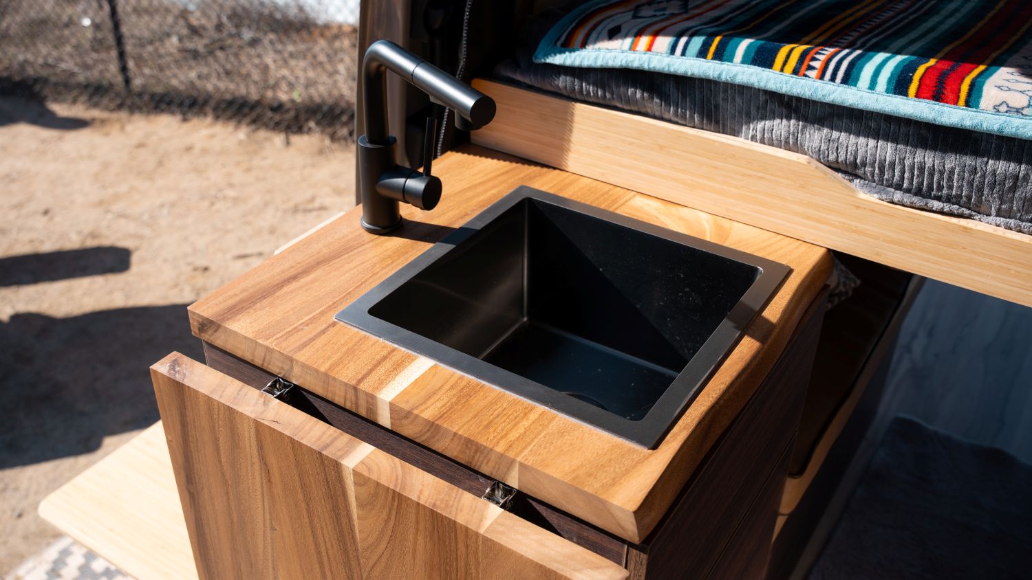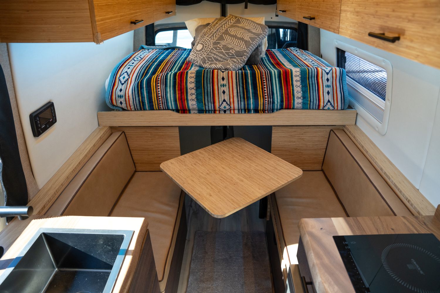 This build highlights Sandy Vans most popular layout – the SV Scout. This floor plan is the best of all worlds combining a dinette with a fixed bed, but literally giving you BOTH! The Bed pulls out over the top of the dinette to create a queen bed, allowing you to sleep the length of the van (North/South).