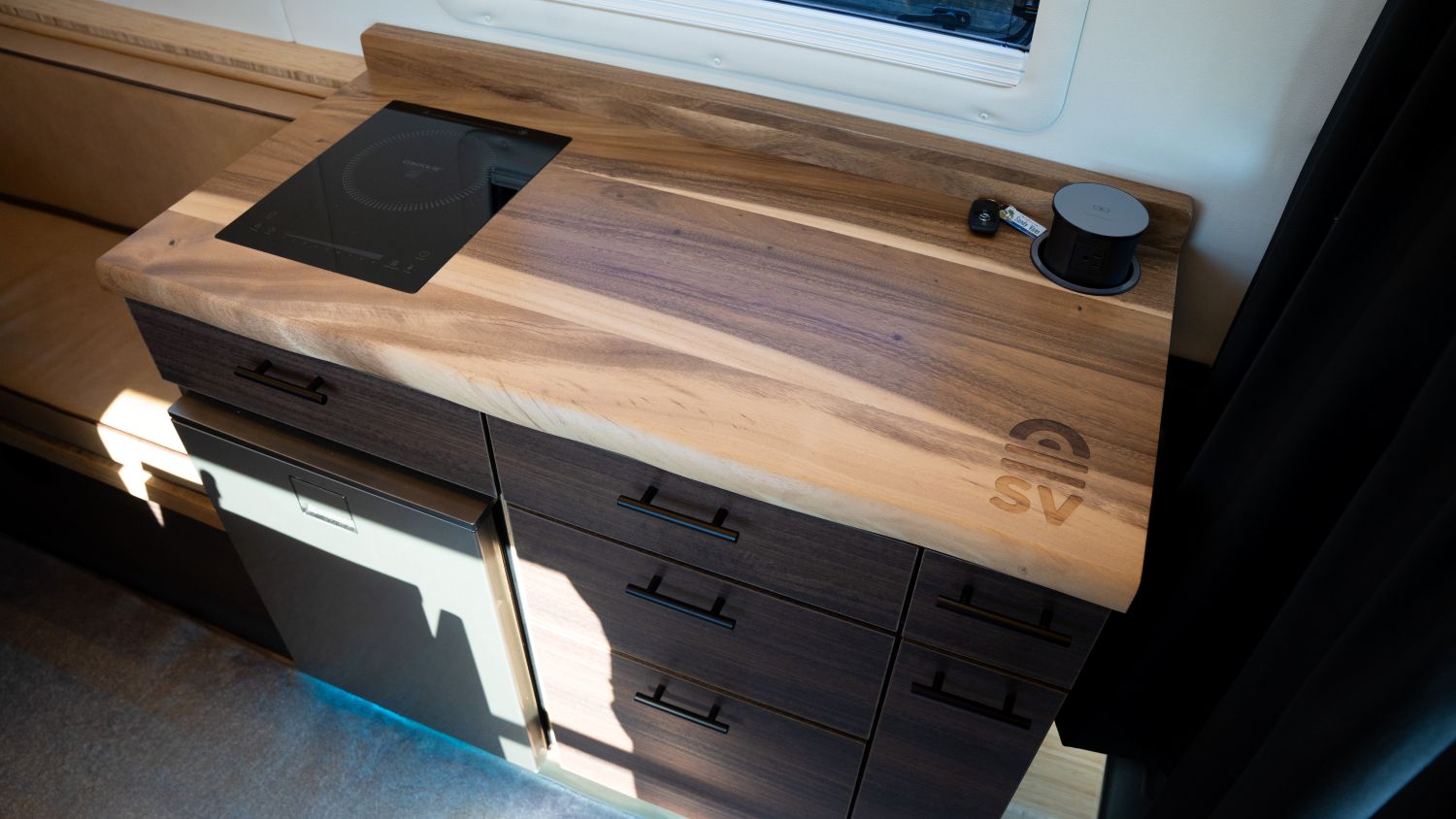 The Scout layout still includes all the normal features that come standard with a Sandy Van. The kitchenette & sink cabinet are located in the usual spot. Electrical system starts with the 412AH lithium battery bank, RedArc Manager 30, Redarc Rogue, and RedArc Redvision display.