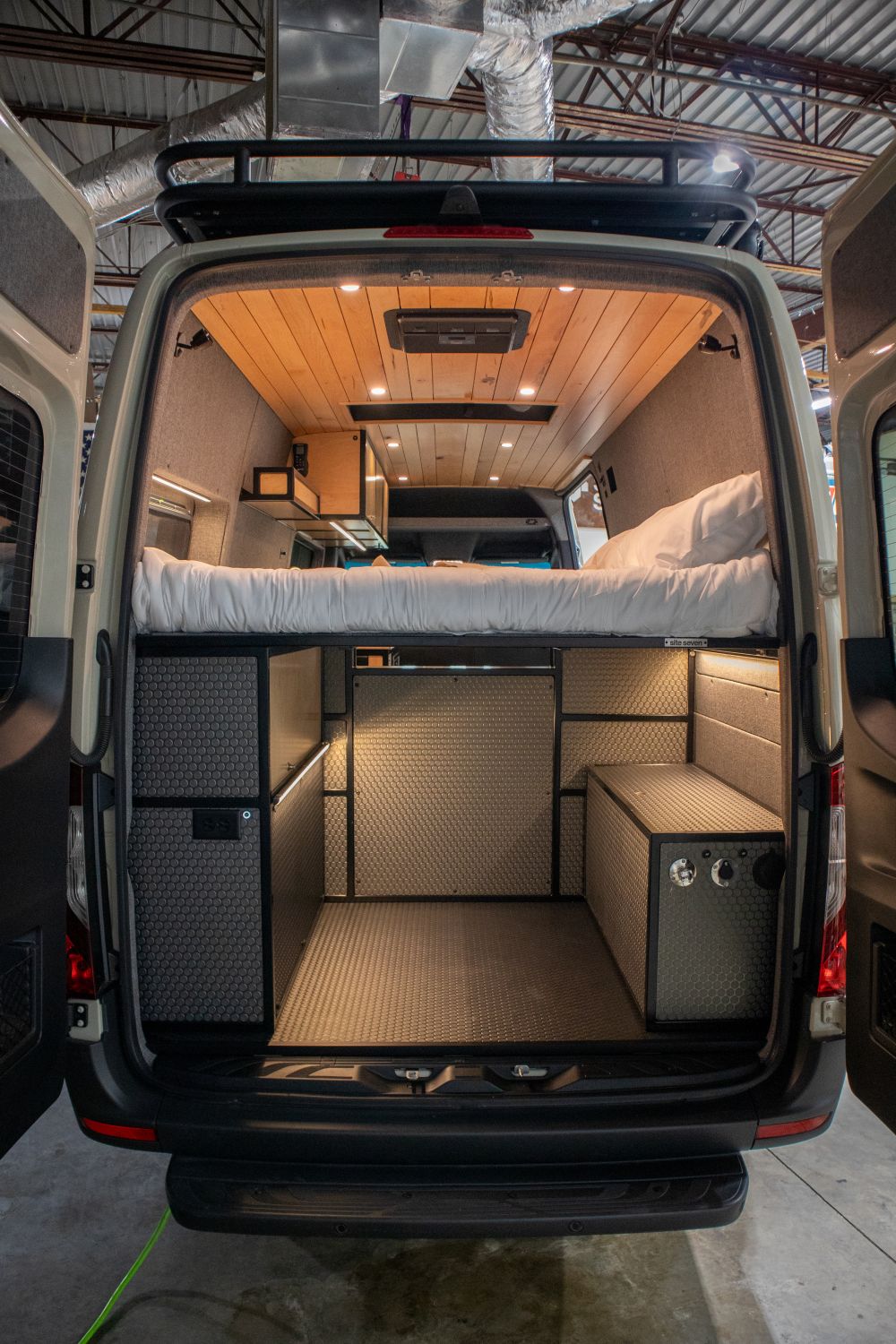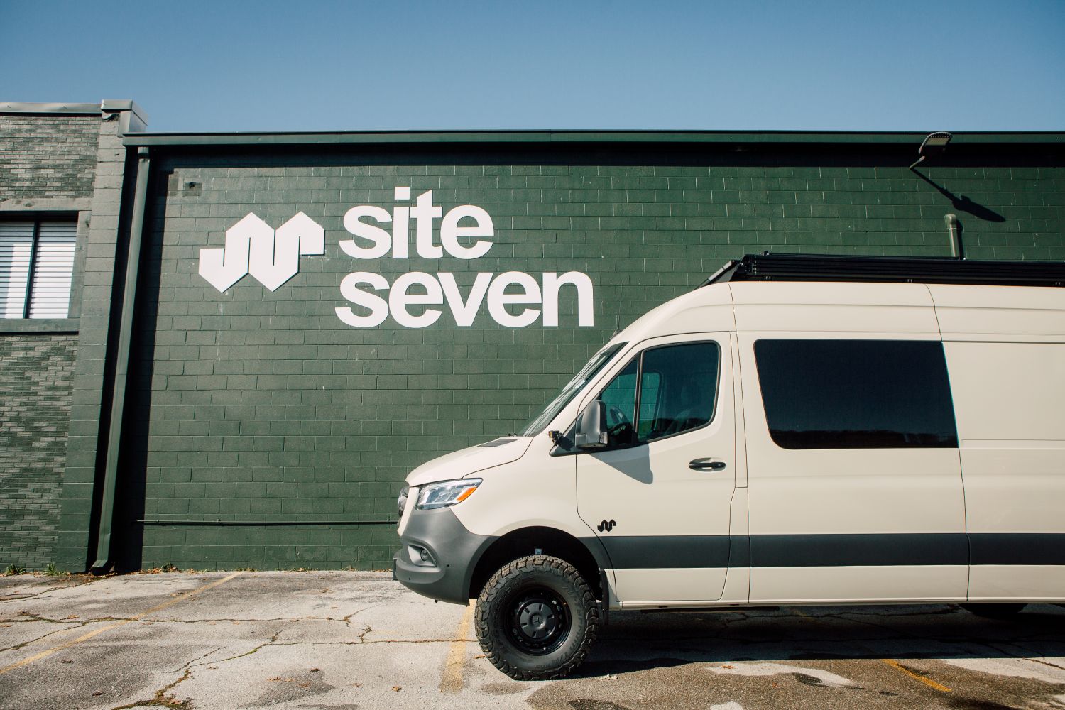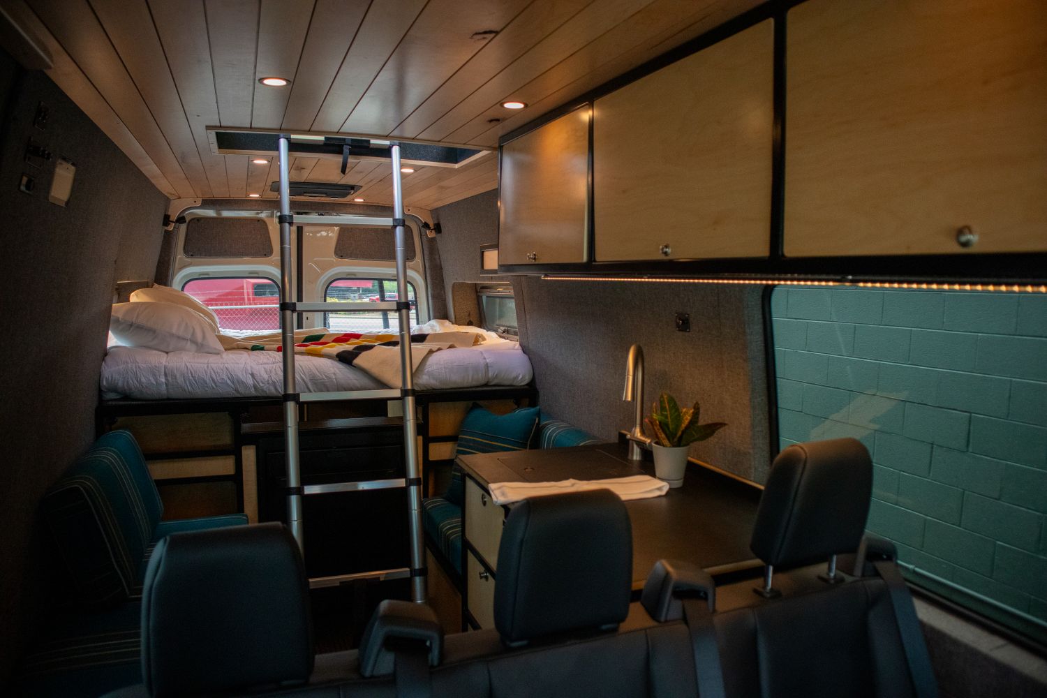 The exterior is equipped with BFG All-Terrain tires, our Site Seven Low Down aluminum roof rack/platform, Van Compass Premium suspension package, Owl van tire/ladder carrier, and newly designed mid-mount front off-road light pods.