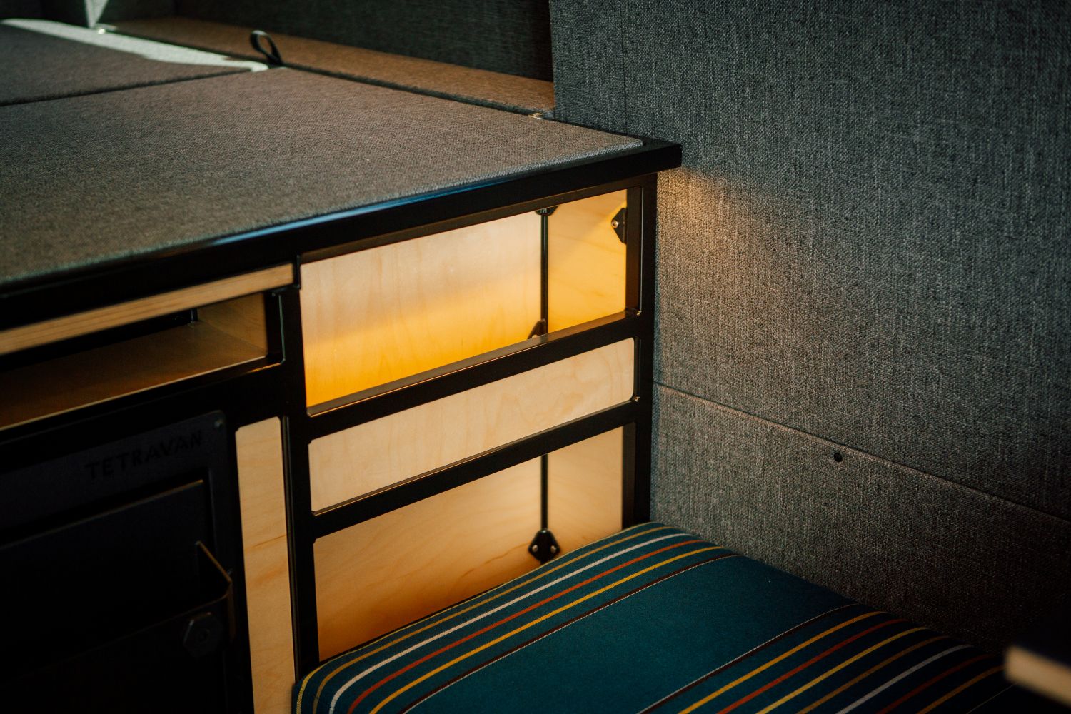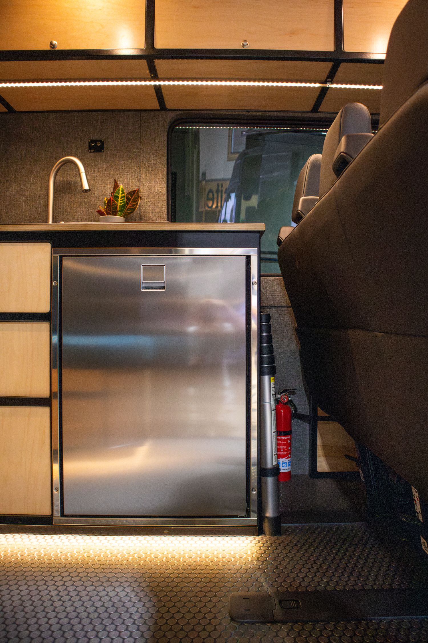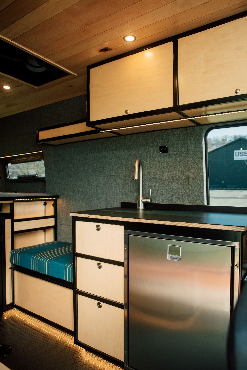 The exterior is equipped with BFG All-Terrain tires, our Site Seven Low Down aluminum roof rack/platform, Van Compass Premium suspension package, Owl van tire/ladder carrier, and newly designed mid-mount front off-road light pods.